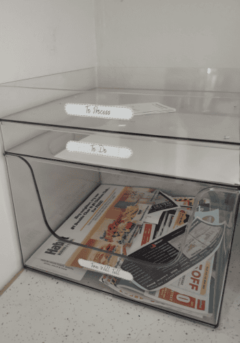 “To Process” bin – All mail and papers that come into the house go here until you sit down to sort through them. No more papers scattered across three different surfaces.