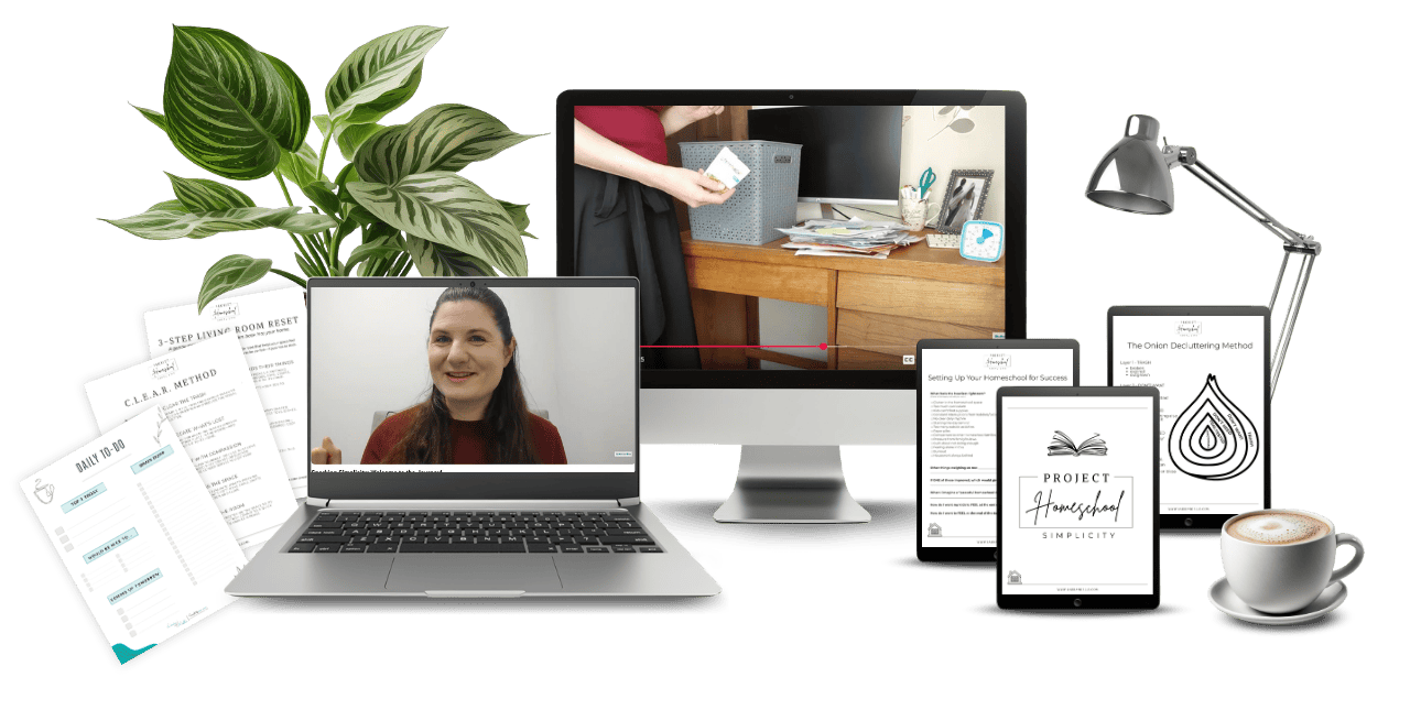Project Homeschool Simplicity is a 6-week guided experience that helps overwhelmed homeschool moms simplify their home, rhythms, and systems so their home and homeschool finally work together instead of against them.