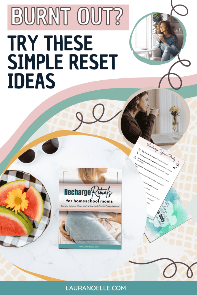 Step 1: Grab the free PDF, Recharge Rituals for Homeschool Moms. Inside, you’ll find three different menus (one for recharging your mind, one for your body, and one for your soul). There are 10 ideas for each area, plus a little tracker to help you build the habit.
